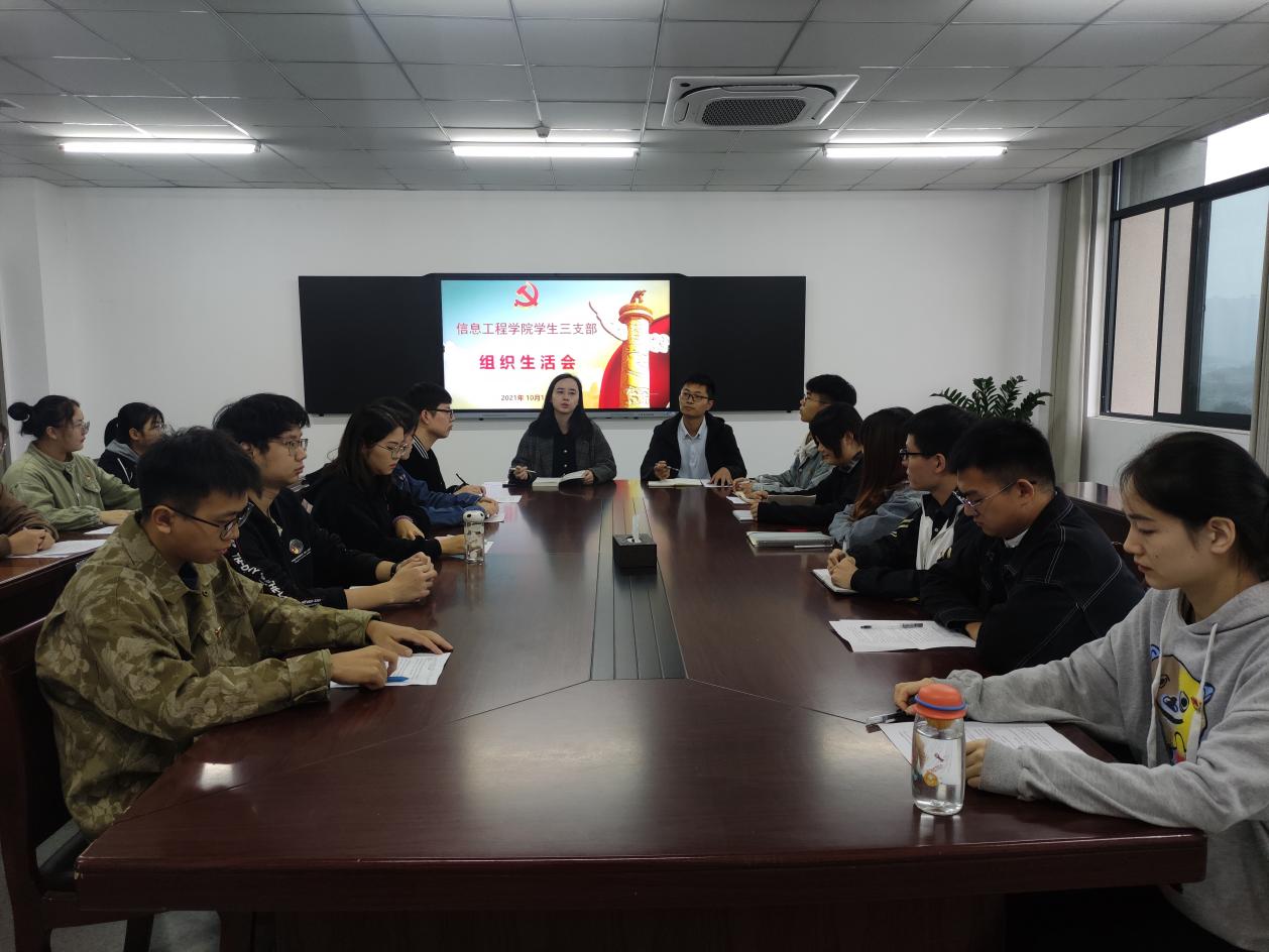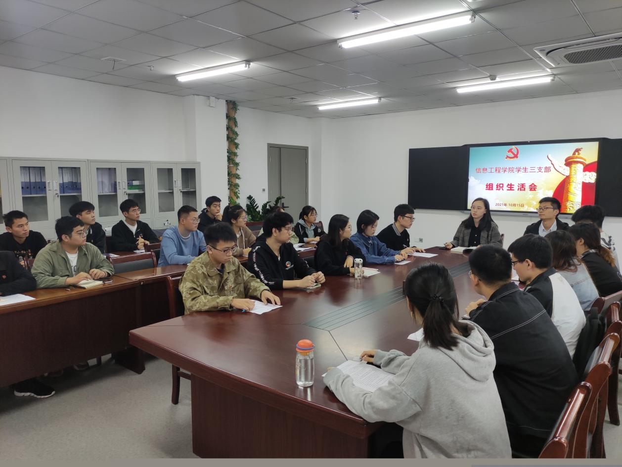 2021年10月18日,信息工程学院学生第三党支部召开党史学习教育专题组织生活会,旨在深入学习贯彻习近平总书记在庆祝中国共产党成立100周年大会上的重要讲话精神,丰富拓展党史学习教育的内涵,推动党史学习教育往深里走、往实里走。会议由支部书记许华瑾主持,首先总结了信息工程学院学生第三党支部工作情况,特别是开展党史学习教育情况,并通报支委会检视问题情况。