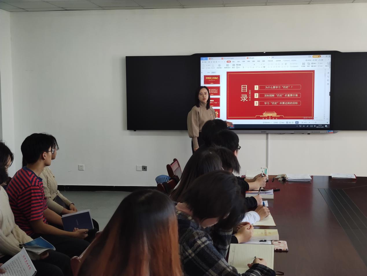 首先,支部书记许华瑾带领支部成员从为什么要学习“四史”?、深刻理解“四史”的重要价值及学习“四史”所要达到的重要目标三个方面激发同学们爱党、爱国、爱人民的热情。同时,号召党员们从以下三个方面入手展开学习:铭记初心,坚定四史信念:多读历史,汲取历史的营养;学思践悟,领会四史内涵:将理论与实践相结合,在发奋图强中锻炼成长;成才报国,传承四史精神,把个人前途与国家未来相结合,把炙热的爱国热情转化为建设祖国的动力。