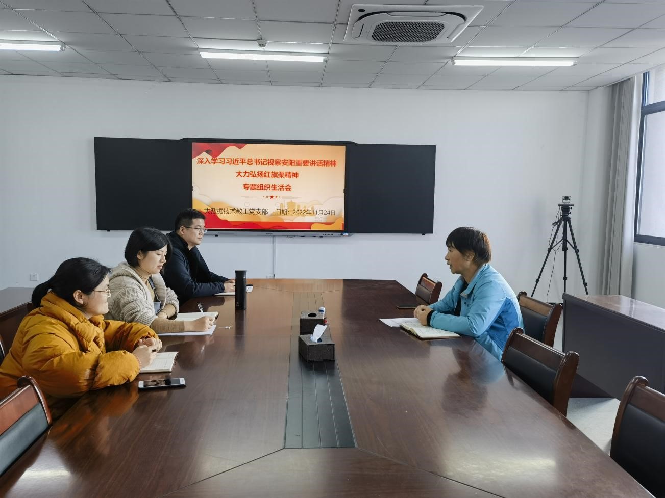 为深入学习贯彻党的二十大精神和习近平总书记视察安阳重要讲话精神,深刻领会红旗渠精神的丰富内涵和时代价值,弘扬伟大建党精神和红旗渠精神,不断增强基层党组织组织力、凝聚力、战斗力,11月24日,大数据技术教工党支部在双创615室召开了“深入学习习近平总书记视察安阳重要讲话精神,大力弘扬红旗渠精神”专题组织生活会,会议由支部书记商信华同志主持,支部全体党员参加。