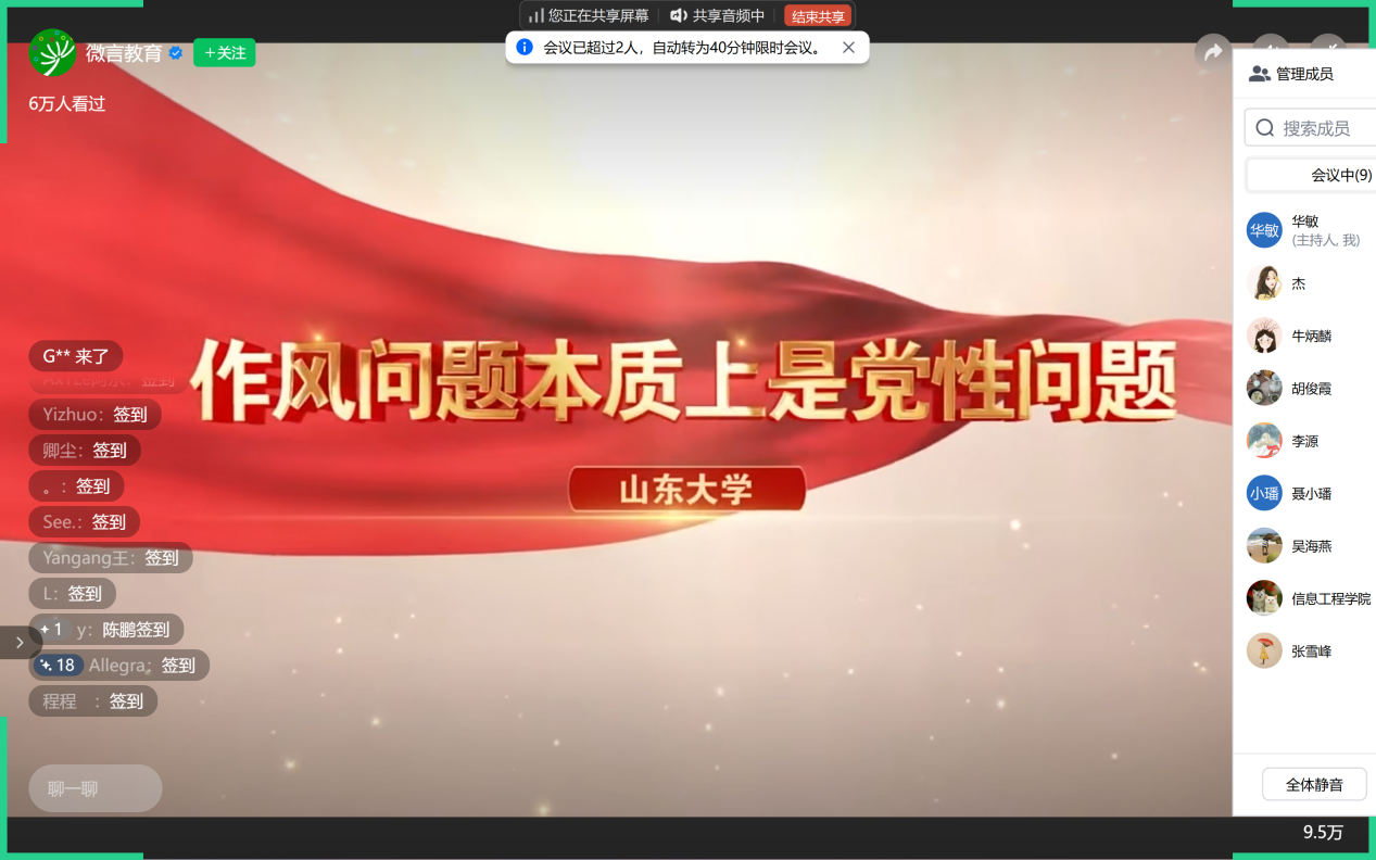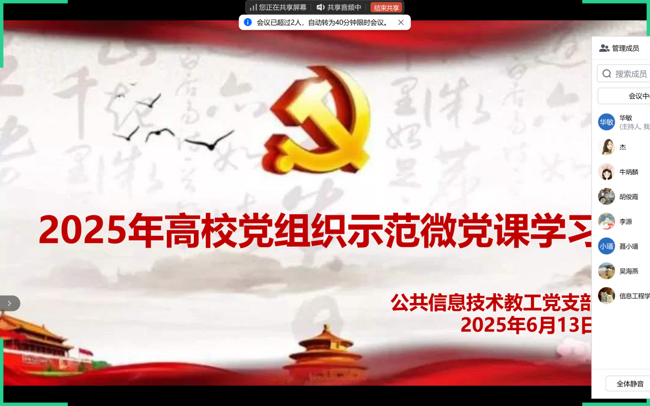 6月13日下午,信息工程学院公共信息技术教工党支部全体党员集中线上收看2025年高校党组织示范微党课(第一阶段)第2讲《党的作风建设的主要内容》,深化党的作风建设学习。