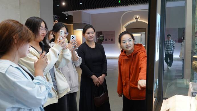 在整个参观过程中,专业教师结合博物馆的具体展项进行现场教学。在信阳市博物馆一楼的VR沉浸式剧场,新生们体验了集“AI+3D”融合技术于一体的虚拟现实环境。在AR交互展台,教师们演示了如何通过增强现实技术让游客“触碰”三维文物,并详细介绍了这类互动设计所涉及的用户界面设计原理和技术实现路径。许多学生表示,通过亲身体验数字媒体技术在文化传承中的创新应用,对专业学习方向有了更清晰的认识。