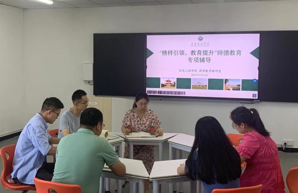 为持续推进贯彻习近平新时代中国特色社会主义思想,进一步加强教师队伍师德师风建设,增强教师立德树人的教育责任感与使命感以及爱岗敬业、为人师表的自觉性,信息工程学院高等数学教研室于7月14日在双创中心505开展“榜样引领,教育提升”师德教育专项辅导活动。