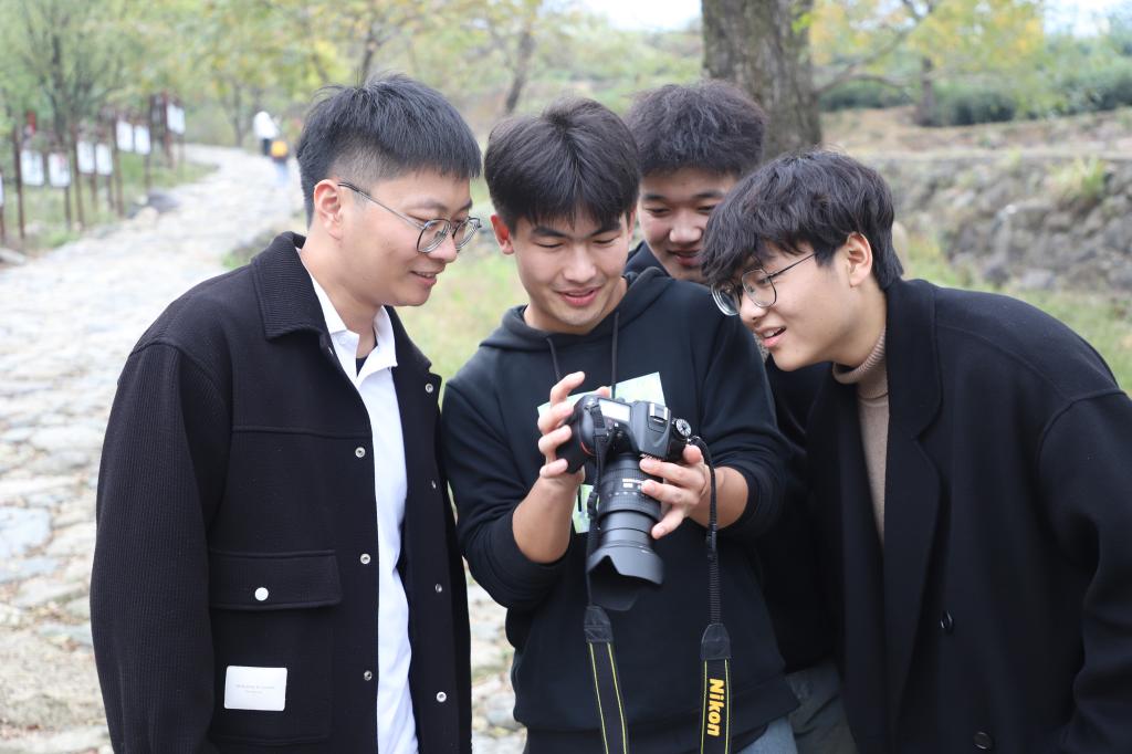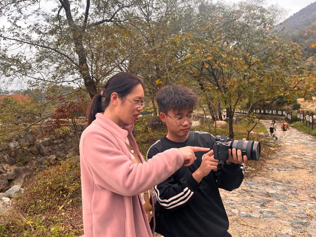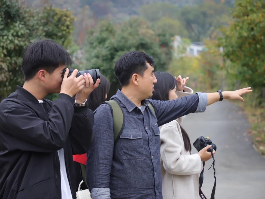 “快来看,这个故事真感人!”“快来拍,这个构图多美啊!”,在课程实践活动现场,同学们不时的互相招呼着。大家充分发挥自己的主观能动性,按照提前构思好的拍摄方案有条不紊的进行拍摄,他们在乡村美景中寻觅红色基因,在丰收的景象中感受时代巨变。指导教师们也没有闲着,他们一会儿指导这个同学如何取景,一会儿指导那个同学如何调整曝光,忙的不亦乐乎,又乐在其中。师生们在亲密无间的交流中拉近了距离,三全育人的细雨无声的滋润着这些可爱的“幼苗”。