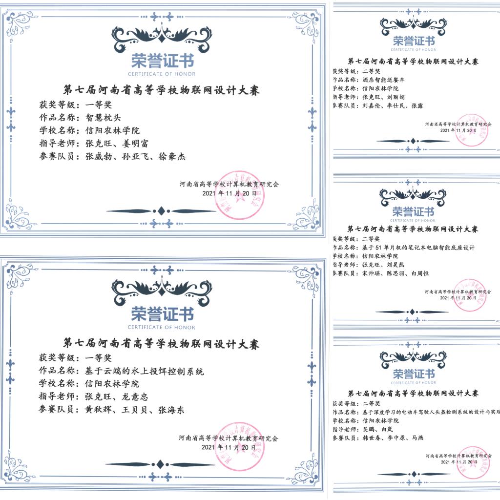 2021年11月22日,由河南省高等学校计算机教育研究会主办、华北水利水电大学承办的第七届河南省物联网设计大赛落下帷幕,我院共有五组队伍参加了比赛,经过激烈的角逐,我院张威博、黄秋辉两组同学荣获一等奖,韩世春、刘嘉伦、宋帅瑶三组同学荣获二等奖。