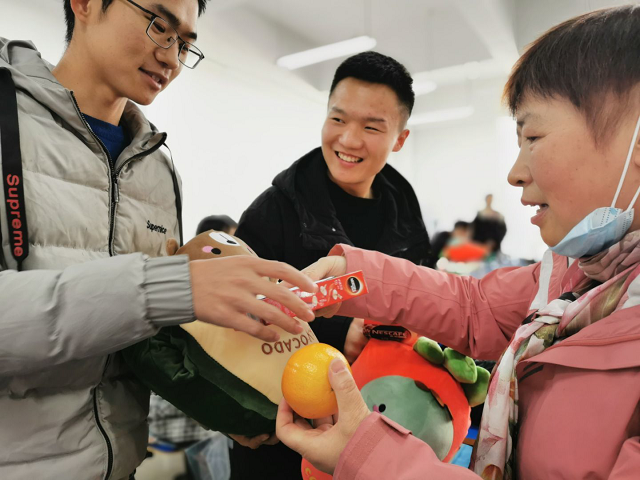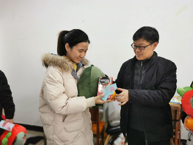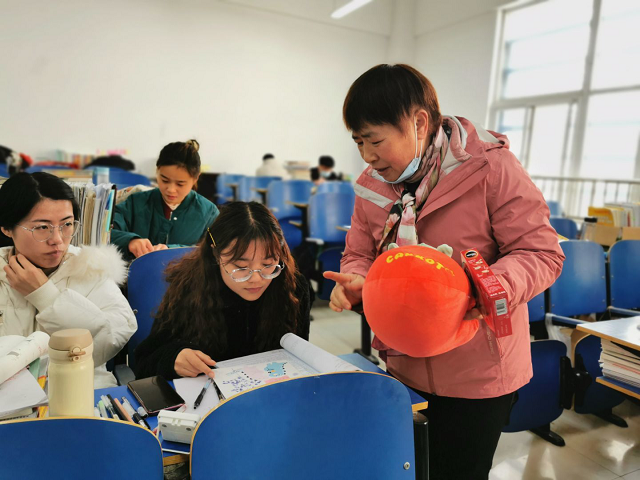 为了不打扰其他同学,一行人悄悄地走进自习教室,同学们见老师和学弟学妹来了,也是非常的兴奋。商院长逐一询问了学生的复习进度、心理状态,并嘱咐同学们一定多吃饭、睡好觉,以饱满的精神应对挑战。随后,商院长代表学院,将提前准备好的抱枕——寓意高“枕”无忧,也为学生们暖暖手、打盹的时候可以抱着休息、橙子——寓意“脐”开得胜、心想事“橙”,还有咖啡送给了同学们。同时,学弟学妹们送上了自己亲手绘制的小卡片,写满了对学长学姐的祝福,也代表了上下年级间的传承。学长学姐们也送出了自己的祝愿,表达了对学弟学妹们的勉励和支持。