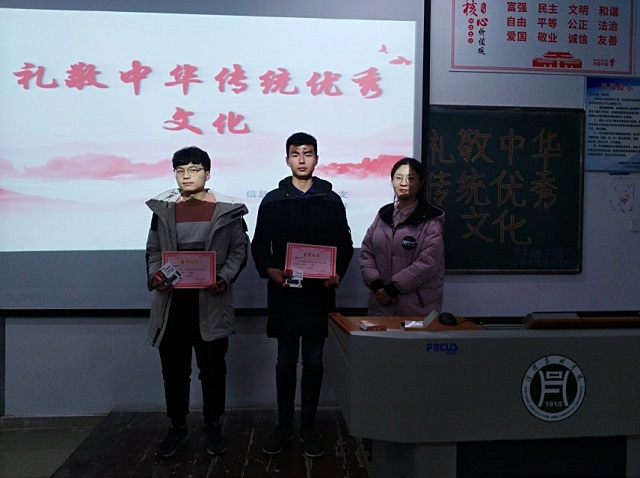 为弘扬中华优秀传统文化,增强同学们对社会主义核心价值观的理解与认识,2019年3月4日晚上7点,由信息工程学院举办的主题为“礼敬中华传统优秀文化”征文颁奖活动于二教205举行,18级辅导员及部分学生参加。