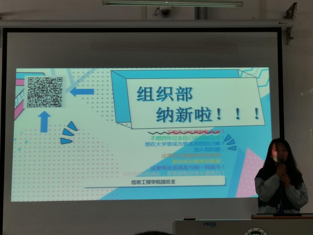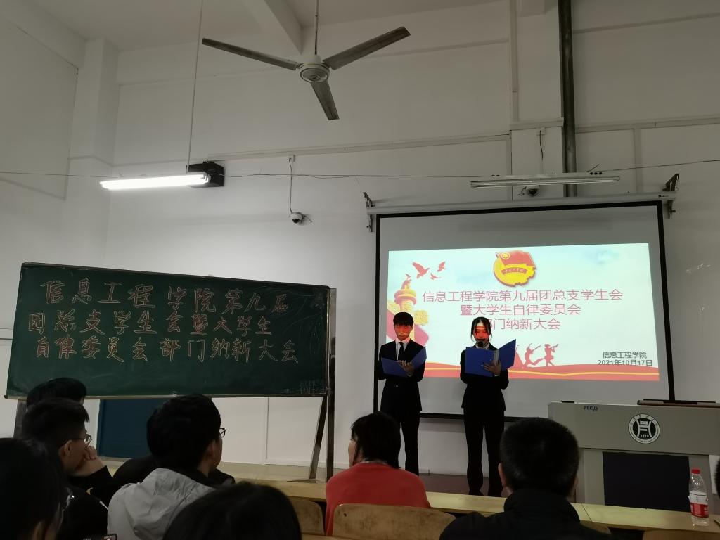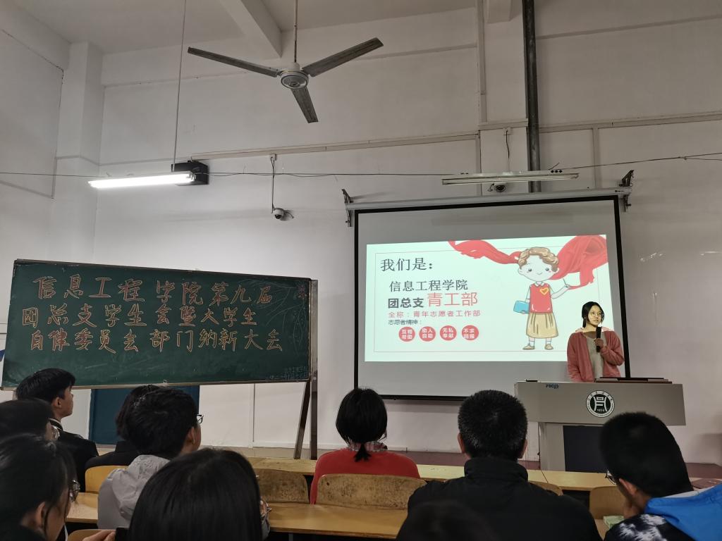 为了更好的宣传信息工程学院团总支学生会和大学生自律委员会,注入新的活力,10月17日晚7点,信息工程学院在二教406教室进行第九届团总支学生会暨大学生自律委员会纳新宣讲。团总支书记严舒平、新生辅导员刘俊耕、朱星星、赵鹏泽参加,各部门负责人以进行宣讲,21级全体同学参与。