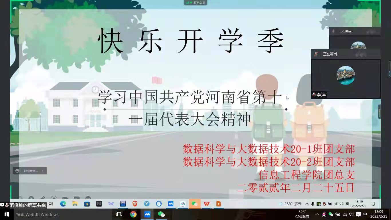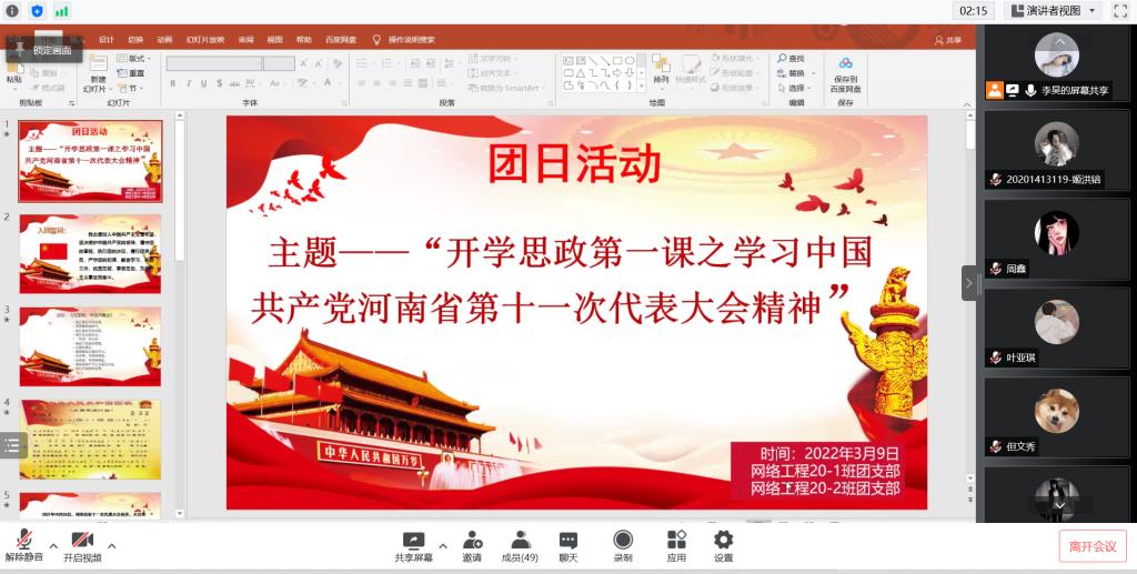 2022年2月21日起,各团支部开展主题团日活动,深入学习了楼阳生在中国共产党河南省第十一次代表大会上的报告。省第十一次党代会明确了“两个确保”的奋斗目标,为我们擎画了全面建设现代化河南的宏伟蓝图,讲话高瞻远瞩、催人奋进。通过此次活动的召开,进一步引导我院团员关注中国共产党河南省第十一次代表大会,进一步培养和增强共青团员的组织意识,更好地了解共青团员的真实想法和心声,让团员们产生归属感和荣誉感,同时也强化了学生爱国意识的具体体现,强化了学生的思想品德教育,形成了良好的校园文化教育氛围。