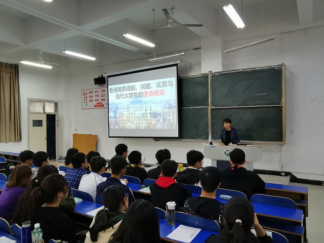为贯彻落实习近平总书记在全国高校思想政治工作会议和教育部《新时代高校思想政治理论课教学工作基本要求》精神,2019年11月15日上午,信息工程学院院长商信华以《香港局势缘起、问题、实质与当代大学生的使命担当》为题,为信息工程学院学生上了一堂形势与政策课程。