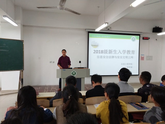 为了营造安全、健康、文明的校园网络环境,提高新生的网络安全意识、防护技能和网络素养,信息工程学院于9月26日上午在二教207、307教室举行了网络安全教育专题讲座。讲座由信息工程学院老师姜明富执讲,学院2018级全体新生参加。