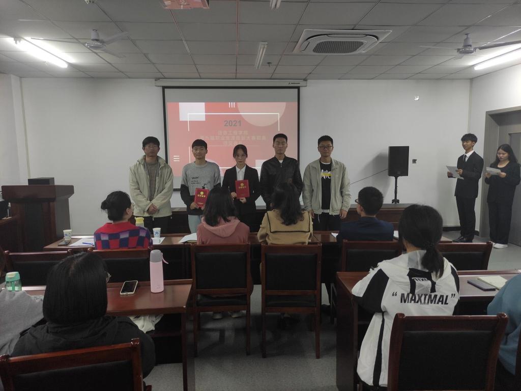 信息工程学院积极组织开展了初赛选拔,经过学院初选确定了8位选手参赛。赛场上,选手们紧扣“逐梦青春·职击未来”的主题,依据自身兴趣爱好与专业发展方向,按照“自我认知、职业认知、职业决策、计划与路径、评估与调整、职业道德”六个方面展示了自己的职业生涯规划设计。选手们思路清晰,语言流畅,内容充实,充分展示了自己的职业规划,获得了评委老师和观摩学生的一致好评。评委老师根据选手们的表现,从《职业生涯规划书》、《职业生涯人物访谈报告》、PPT现场展示及职业角色情景模拟四个方面进行了打分。最终,王海洋同学获得特等奖,张耀辉、刘柳荫和杨晓东同学获得一等奖,雷鑫、赵添宇、马森野和栗子涵同学获得二等奖。