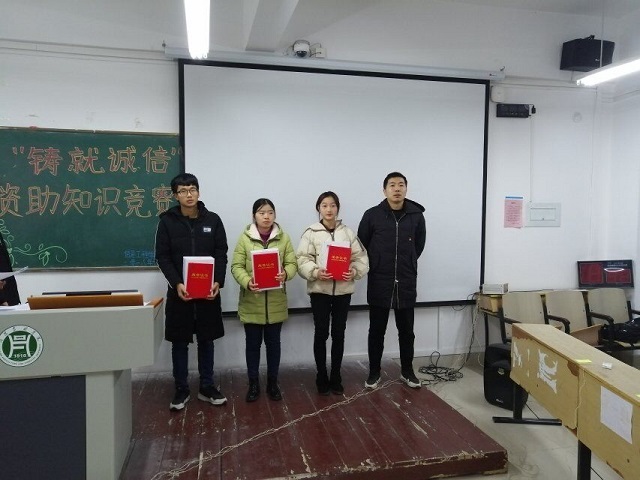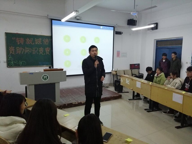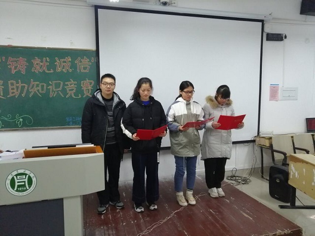 2018年12月7日晚19点整,信息工程学院于beat365在线平台官网二教307教室开展了以“铸就诚信”为主题的资助知识竞赛。辅导员马原、王冯、张睿出席本次活动并担任评委,18级同学参与了本次活动。