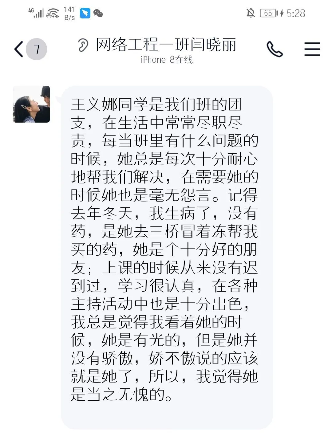 王义娜同学,入学至今担任班级团支书,思想政治素质较高,学习刻苦努力,成绩优异,团结同学,热爱集体,尊敬师长,具有很强的责任心和集体荣誉感,获得了老师与同学的一致好评。