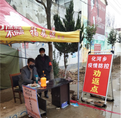 在疫情期间,该生牢记使命,主动担当,在河南省商水县化河乡疫情防控劝返点站岗执勤,负责归乡人员消毒和测量体温的工作。