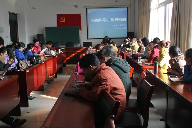 根据学校关于认真开展反邪教法治宣传月活动的通知要求,为了加强“崇尚科学、反对邪教”的宣传教育力度,提升广大师生识别邪教、抵制邪教的能力。2015年12月29日下午,信息工程学院召集全院教师在1A307会议室观看学习影片,组织教育学习。活动由李友国副院长主持。