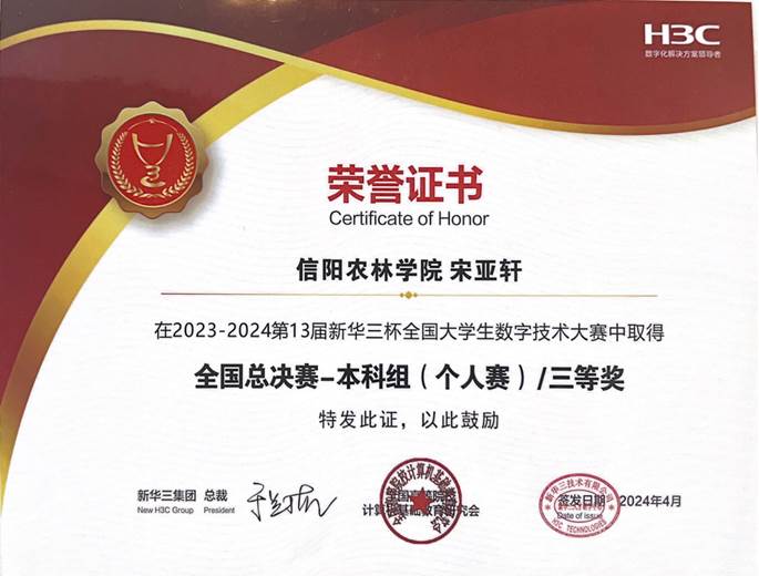 4月26日-28日,第十三届“新华三杯”全国大学生数字技术大赛决赛在杭州成功举办。本届大赛参与院校665所,初赛学生报名人数超过38000人。信息工程学院学生宋亚轩同学初赛荣获河南省省赛特等奖,直通国赛决赛。经过激烈角逐,宋亚轩同学荣获全国大学生数字技术大赛决赛本科组(个人赛)三等奖。