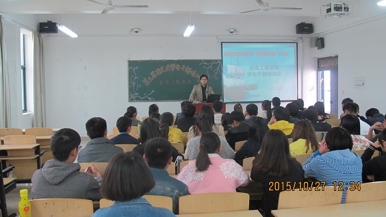 2015年10月17日中午12:30信息工程学院在2教202教室举办以“用智慧塑造形象 以修炼打造‘合金’”为主题的学生干部培训会,培训会由学院团总支书记朱猛老师主讲,信息工程学院第三届团总支学生会成员和2015级各班班长团支书参加了此次会议。