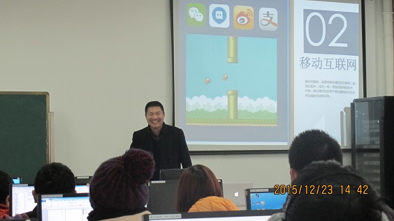 2015年12月23日下午4:30,在1A科技楼302实验室,信息工程学院邀请企业专家、蓝鸥科技有限公司市场部总监杨宁工程师来校为2016届毕业生做有关“移动互联网现状和发展”的报告。报告会由朱猛老师主持。