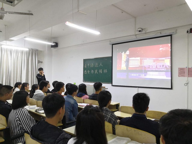 为加强学生意识形态教育,树立坚定的理论自信,文化自信,制度自信。2018年10月17日晚,信息工程学院学生在新生辅导员的带领下,在二教214B教室集体观看了由中央电视台综合频道推出的《百家讲坛》特别栏目《平“语”近人——习近平总书记用典》第一集:《一枝一叶总关情》。