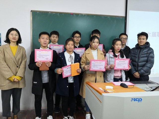 2018年11月16日中午,信息工程学院在二教202开展了第六届大学生职业规划大赛获奖颁奖活动。14名获奖同学、团总支学生会干部和部分学生代表参加了本次活动。团总支书记朱猛老师,辅导员马原、严舒平、张睿、宋东阳老师为获奖同学颁发了奖品和奖状。