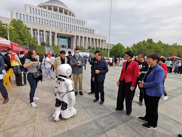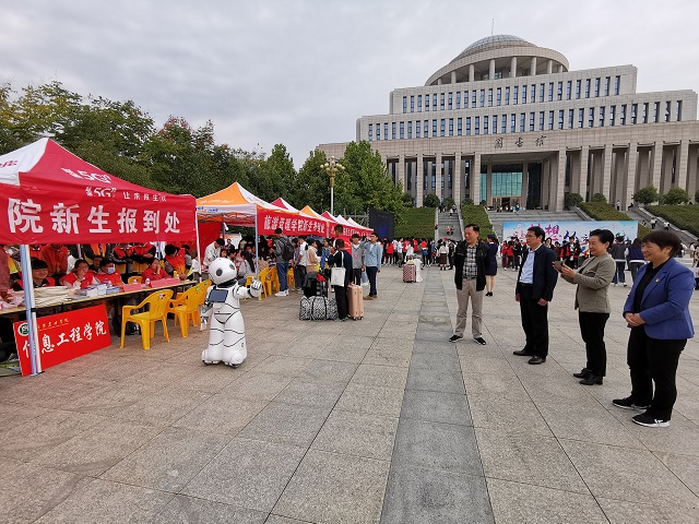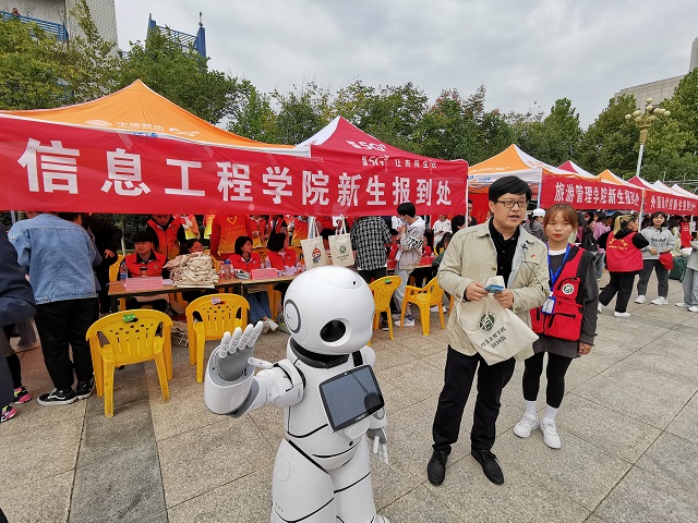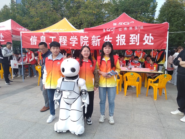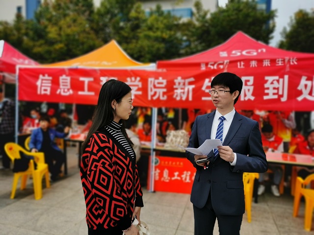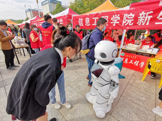 2020年10月10日,信息工程学院迎新工作如火如茶地进行着,力求为新生提供最好的服务。上午,校党委书记余作斌、副校长黄遵东、赵聘、王万玲莅临我院迎新现场视察工作,亲切询问新生报到情况。随后,余作斌书记与我院迎新智能机器人“优优”进行了友好互动。