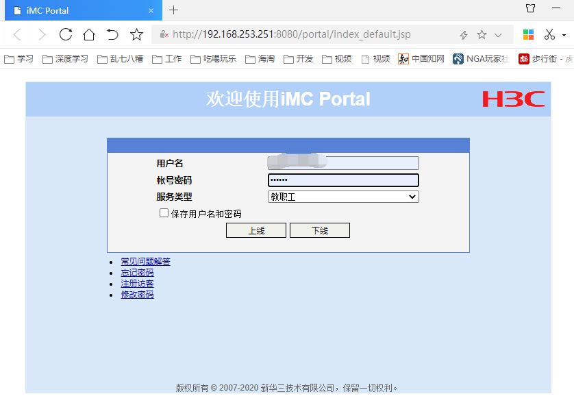 第一步:打开浏览器会自动跳转出如下图登录界面,输入用户名(工号)和账号密码(身份证后六位),点击上线即可上网。若无法跳转则打开浏览器输入 /index.html 即可跳转(第一次登录成功后,以后只需要连接有线网络即可上网),如图11所示。