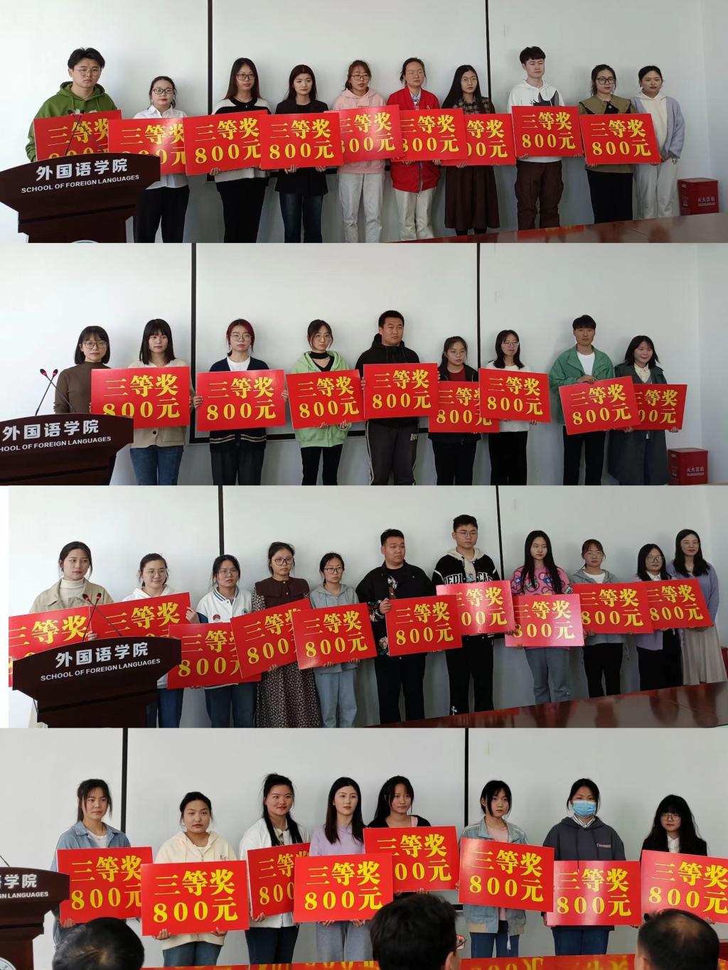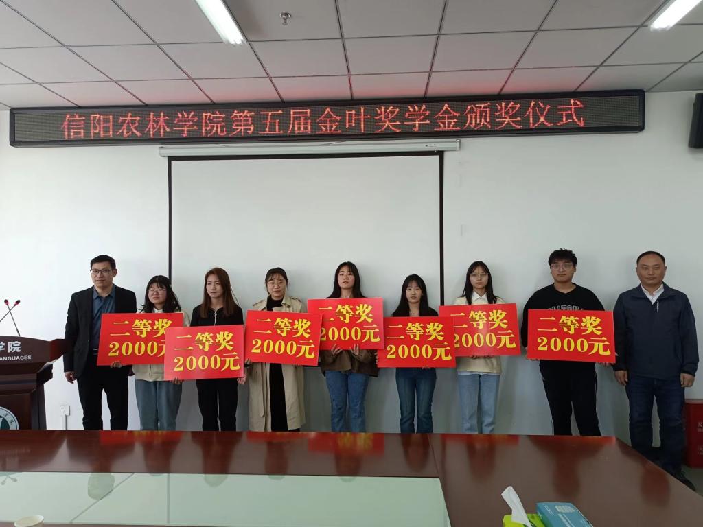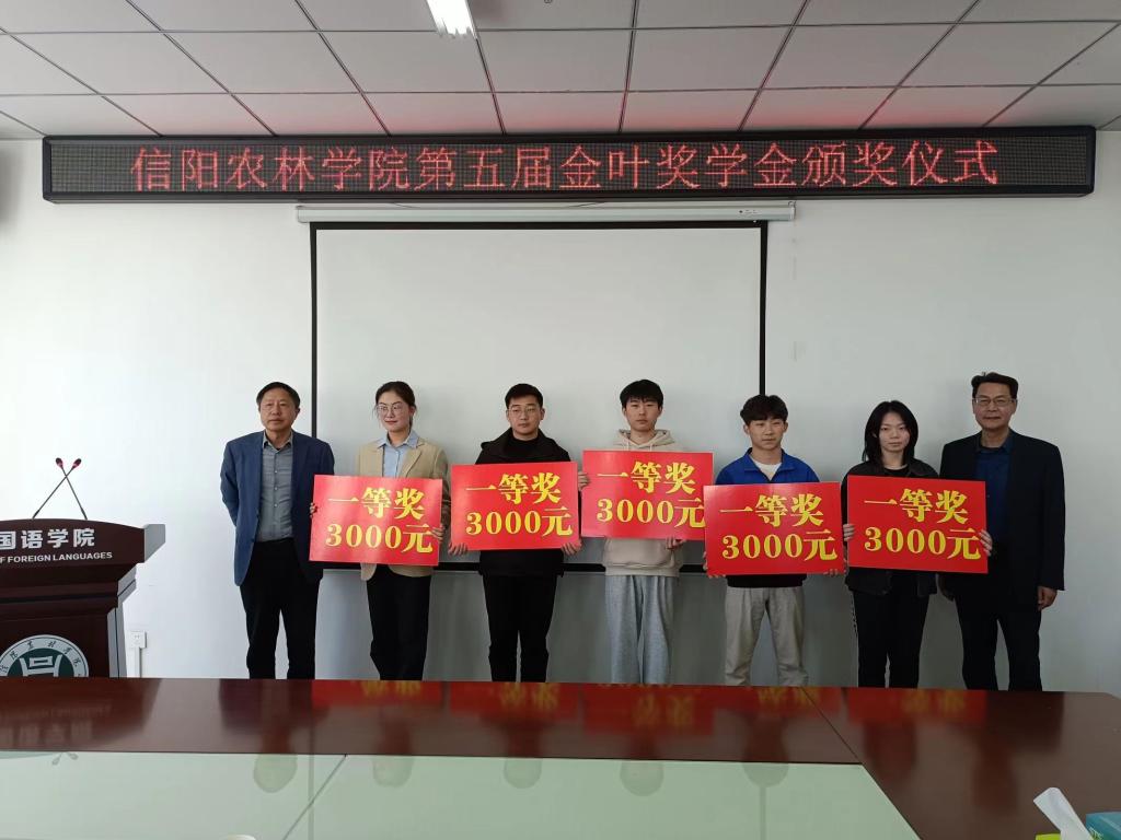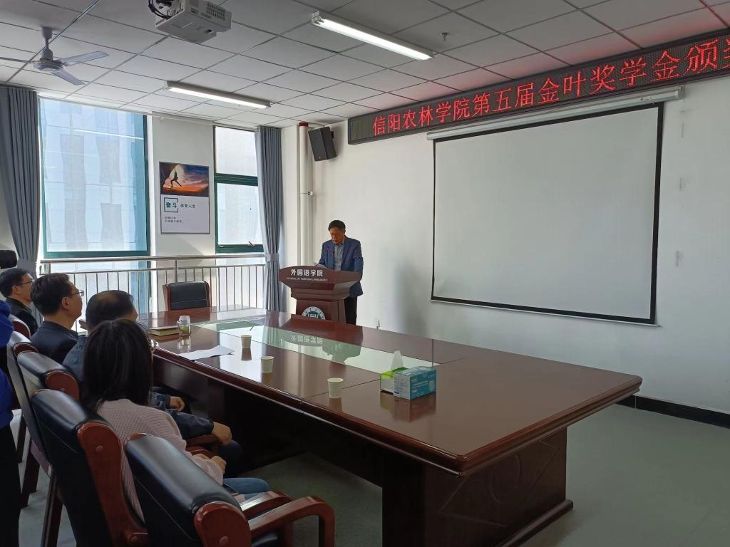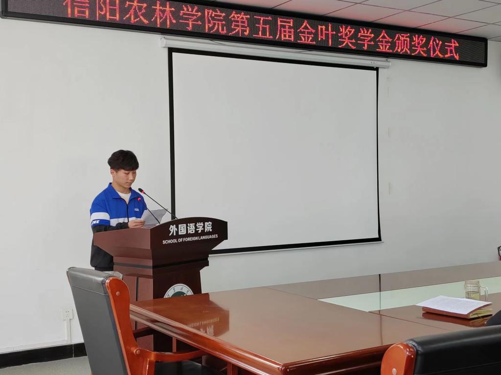 3月14下午,beat365在线平台官网第五届“金叶奖学金”颁奖仪式于文学艺术楼402举行。本次颁奖仪式由校信息化建设与管理中心主办,外国语学院承办。校信息化建设与管理中心主任杜永强、外国语学院党总支书记张志强、校信息化建设与管理中心副主任张耀军、外国语学院党总支副书记吴宏,及旅游管理学院、食品学院、规划与设计学院、外国语学院的教师代表和获奖学生参加了本次仪式。