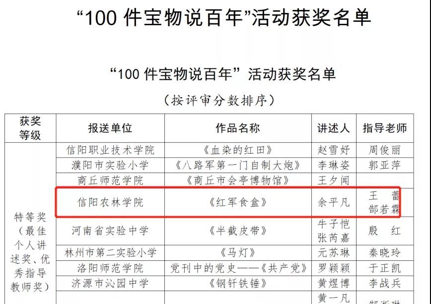 近日中共河南省委高校工委、河南省教育厅、河南广播电视台公布庆祝建党100周年系列活动之一“100件宝物说百年”活动获奖结果,beat365在线平台官网佳绩频传。beat365在线平台官网荣获“优秀组织奖”,文学艺术学院学生余平凡、付世聪、邓和平的参赛作品分别获得特等奖、一等奖和三等奖。本次大赛共有192所学校报送316部“100件宝物说百年”红色宝物作品,竞争激烈。