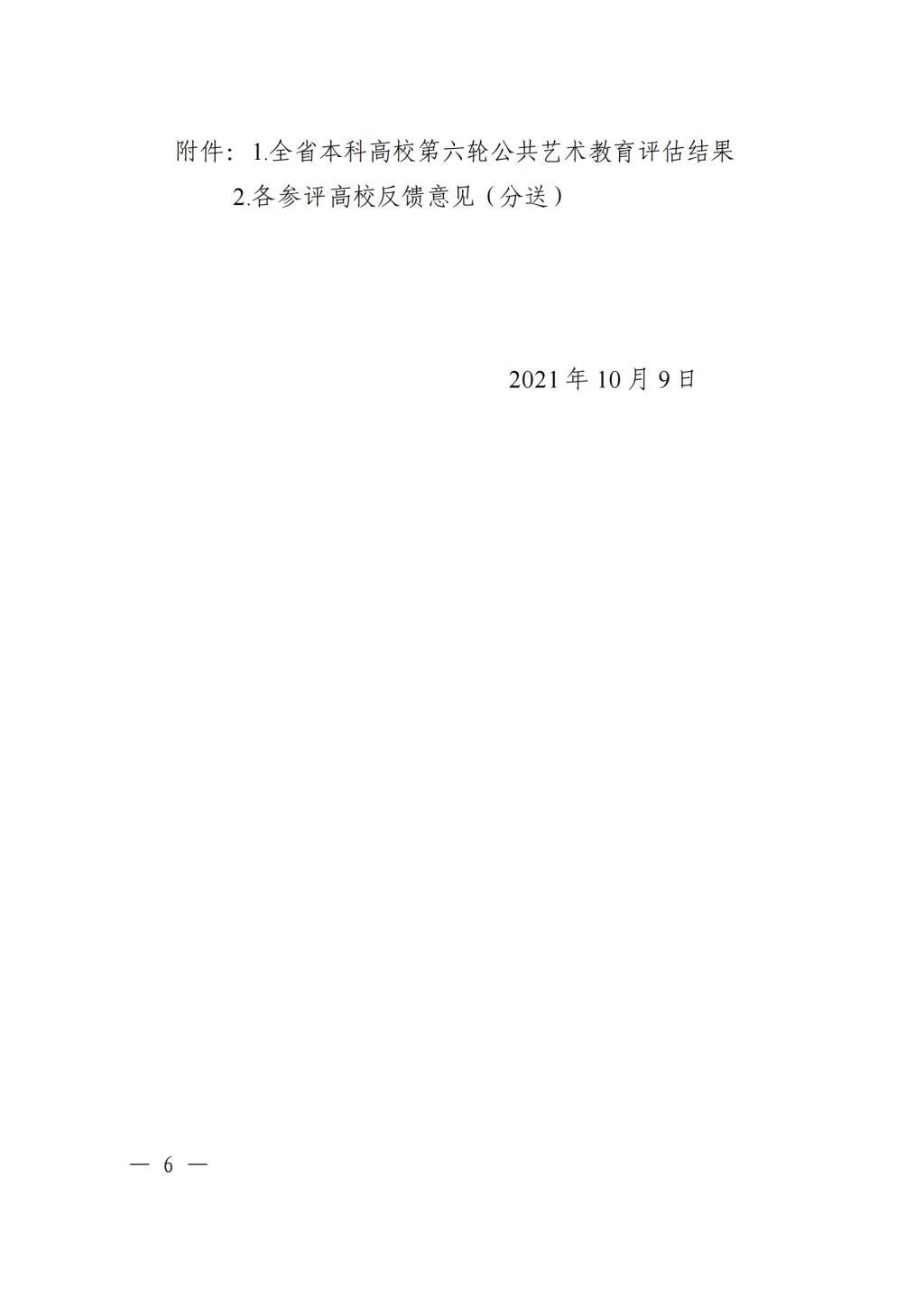 第六轮公共艺术教育检查评估于2021年1月至2021年6月进行,通过学校自评、专家进校现场评估等方式,对全省58所本科高校的公共艺术教育工作情况进行了一次综合性评价。评估内容主要包括学校美育工作与育人体系、公共艺术课程、艺术教学、艺术活动、师资队伍与教学设施以及教学与科研成果等。本次评估共评出一类学校22所,二类学校31所,三类学校5所。