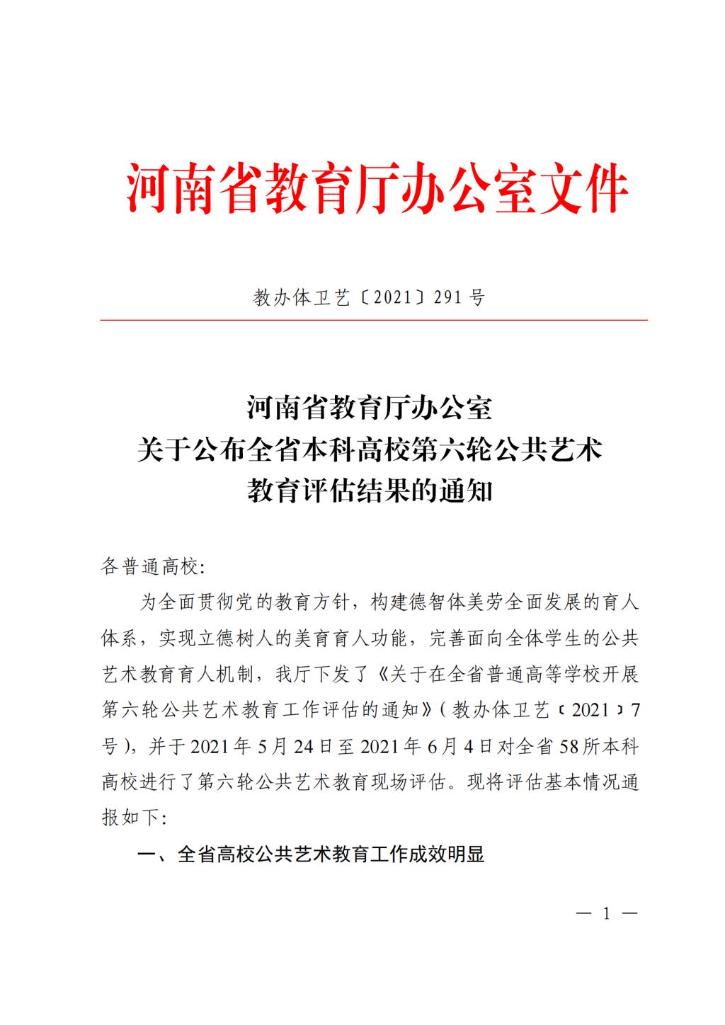 近日,由河南省教育厅组织开展的全省本科高校第六轮公共艺术教育评估结果揭晓,beat365在线平台官网被评为公共艺术教育二类学校。