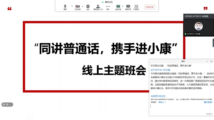 普通话是现代汉语的标准语,是我国各族人民的共同语言,是我国广大人民交流的工具,为了提升我院师生语言能力,传承发展中华优秀传统文化,为构建和谐向上的校园文化营造良好的语言环境,水产学院于9月14至9月18日期间各年级班级分别开展了线上“同讲普通话,携手进小康”主题班会。