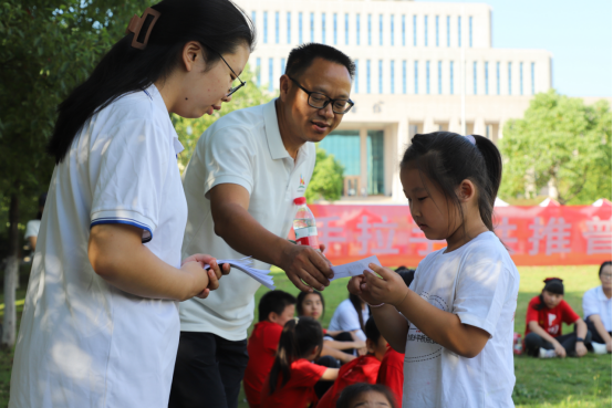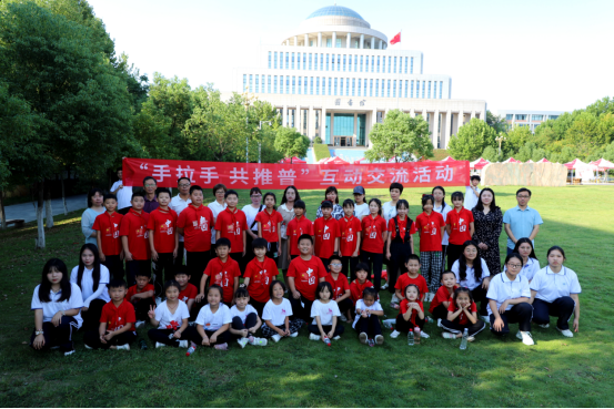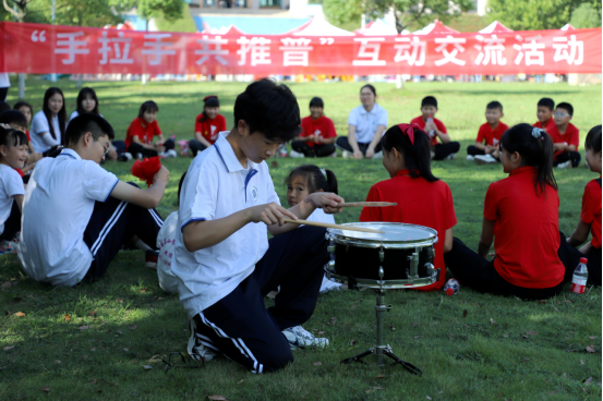 9月15日下午,beat365在线平台官网汝宁广场旁草地上传来阵阵欢声笑语,击鼓传花、诗词接龙游戏火热进行。来自黑马石小学的31名学生、9位老师与beat365在线平台官网的师生一起围坐,通过趣味互动共同感受普通话和中华经典诗词之美,随后两校学生一起进行了经典诗文诵读。