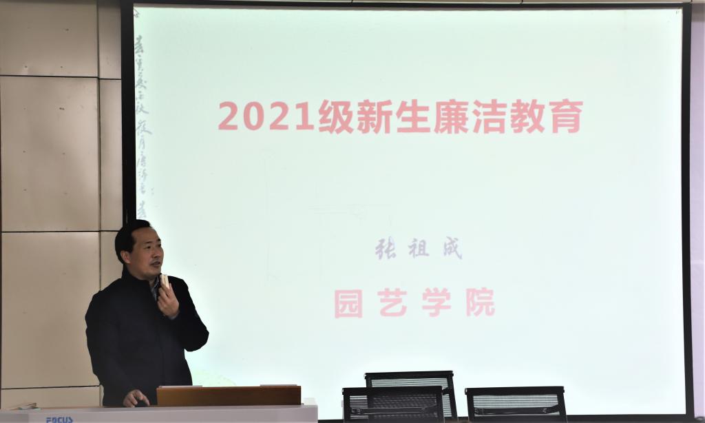 2021年10月10日,园艺学院党总支在2教204开展2021级新生廉洁教育主题党课。2021级全体新生参加了此次教育活动,党总支书记张祖成主讲。