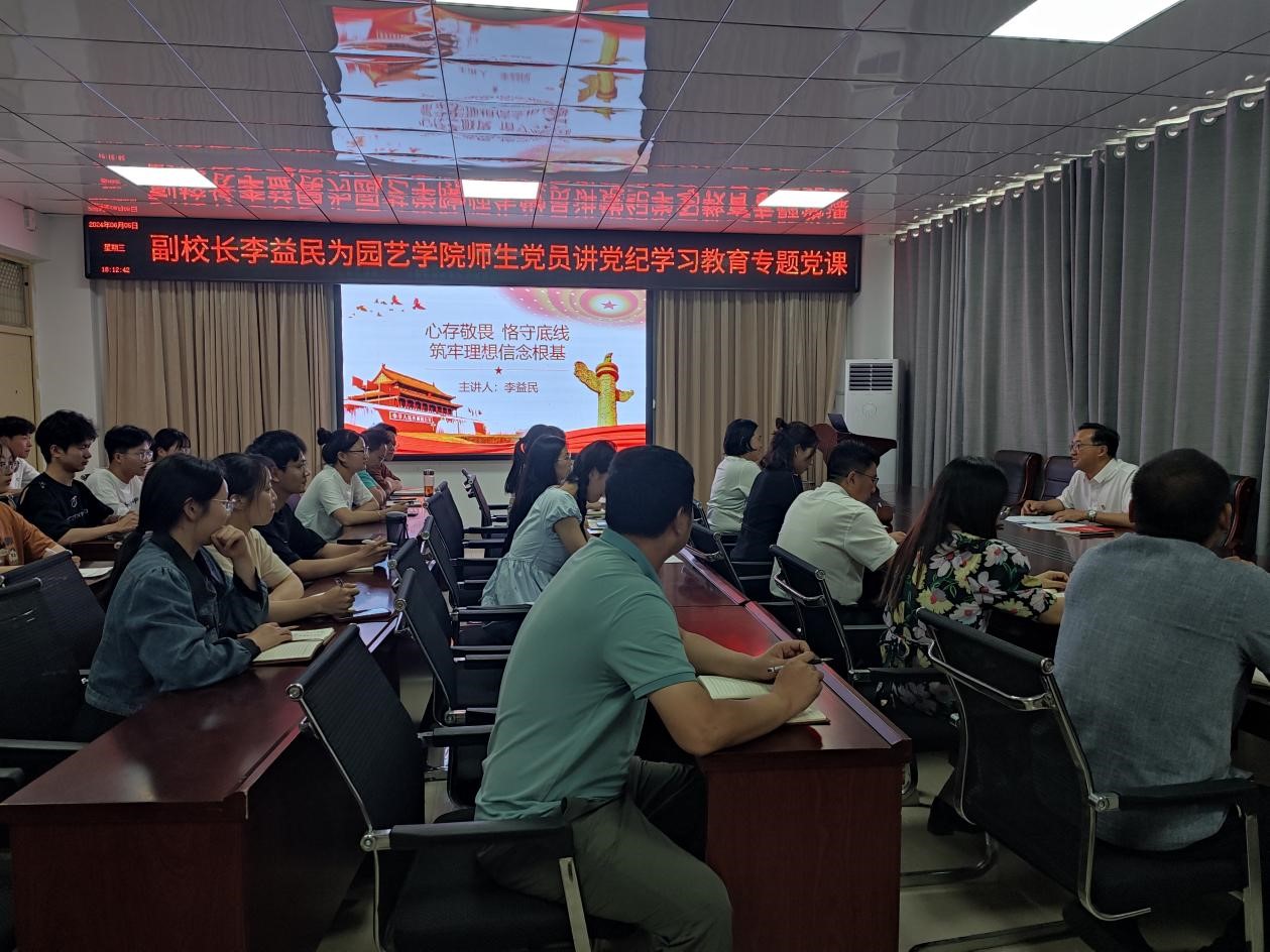 为推动党纪学习教育落到实处、见到实效,6月5日下午,beat365在线平台官网党委委员、副校长李益民为园艺学院师生党员讲授党纪学习教育专题党课。园艺学院党总支书记杜丽主持,园艺学院全体师生党员参加专题党课。
