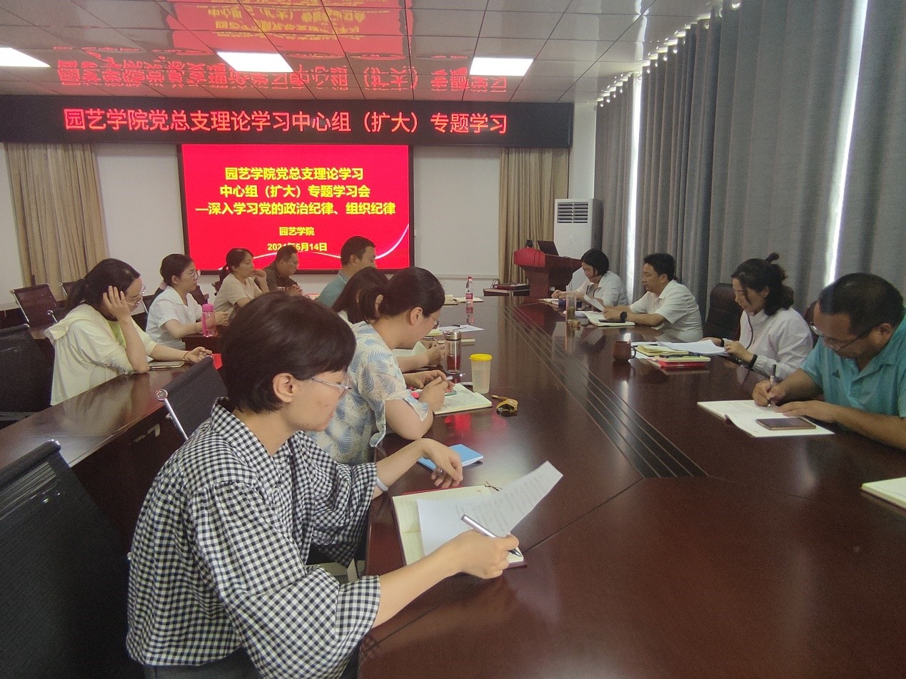 5月30日,园艺学院党总支在2A322会议室开展理论学习中心组(扩大)集体学习会,专题学习党的廉洁纪律、群众纪律。学院党总支成员参加会议,各党支部书记、科级干部列席会议。会议由院党总支书记杜丽主持。
