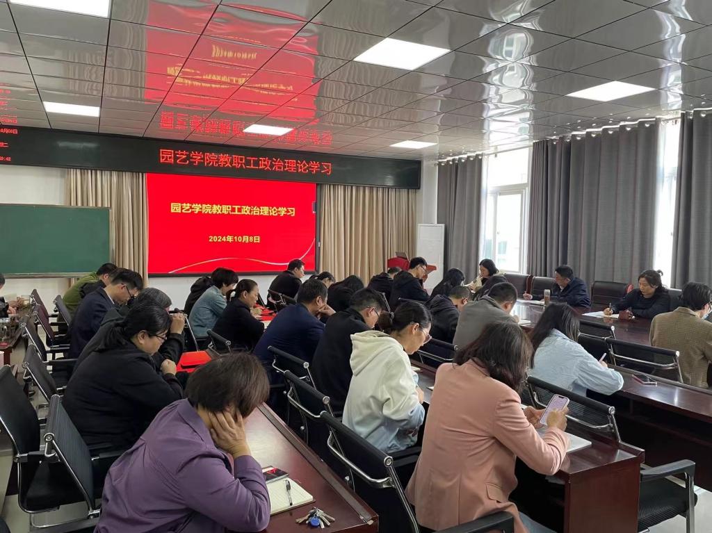 10月8日,园艺学院党总支在实验楼2A-322会议室召开政治理论学习会,学院全体教职工参会,会议由院党总支书记杜丽主持。
