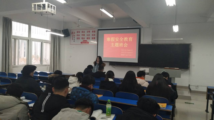 班会开始,辅导员首先向全体学生发出号召:学习安全知识,增强安全意识,提高避险能力。其次,进行针对性的教育,从交通安全,校园安全,假期安全三大方面入手,对学生进行了一次深刻的安全教育。并重点强调了道路交通、安全用电、燃放烟花爆竹、防意外伤害、防火、防煤气中毒等方面的安全教育,增强学生的安全意识和法制观念,提高学生防范安全事故的能力和安全自救能力。最后,寒假期间还要合理安排作息时间,加强体育锻炼,不暴饮暴食,养成健康的生活卫生习惯。