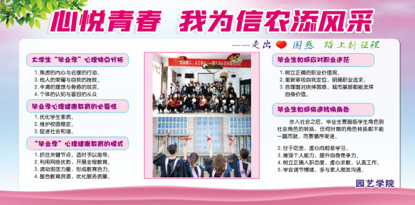 为全面了解我院毕业生心理健康状况,提高心理健康教育工作的针对性和科学性,确保毕业生顺利毕业、文明离校和充分就业,园艺学院于5月25日带领部分毕业生参观了在汝宁广场展出的“心悦青春,我为信农添风采”毕业生心理疏导、心理健康知识展板。