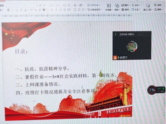 按照学院统一要求,各辅导员老师们通报了暑期参与抗涝、抗疫值班的学生名单,表扬了他们的敢于作为和担当意识,并号召同学们积极向参加抗涝抗疫的优秀志愿者们学习,从我做起,展现当代大学生积极奋进的精神面貌。提醒同学们及时完成“5+X”社会实践的各项材料,并形成总结,返校后按要求汇总提交。通报了学生健康打卡情况,并要求同学们务必认真地按时完成连续14天的健康打卡,作为能否返校的凭据之一。最后辅导员和同学们沟通了线上云网课的上课事宜,提醒同学们务必提前做好充分准备,手机充足电,提前和老师沟通上课事宜,提前10分钟进入云课堂。辅导员还叮嘱同学们在家陪伴父母要细心、耐心,做一些能力所及的家务活儿,返校在即注意路途防护等等。