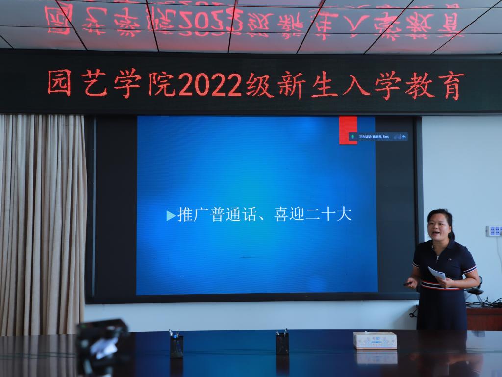 按照学校总体部署,9月14日,园艺学院对全体新生开展了“推广普通话,喜迎二十大”的专题教育。受疫情等因素影响,本次讲座以线上形式进行,全体新生参加了本次专题教育培训。党总支副书记陈丽文主讲。