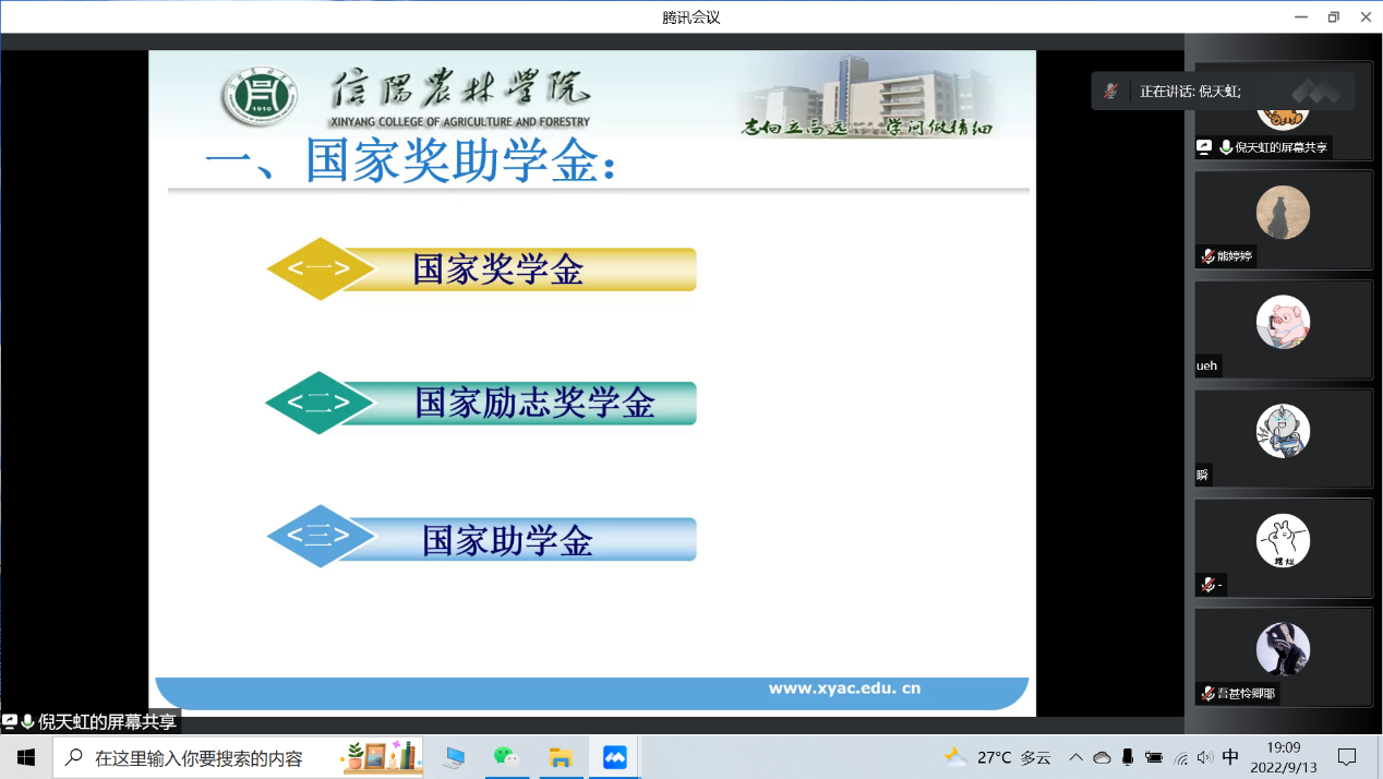 9月13日晚上7点,beat365在线平台官网园艺学院在腾讯会议上召开以“大学生资助政策”为主题的讲座,2022级全体新生和2022级新生辅导员参加了此次会议。
