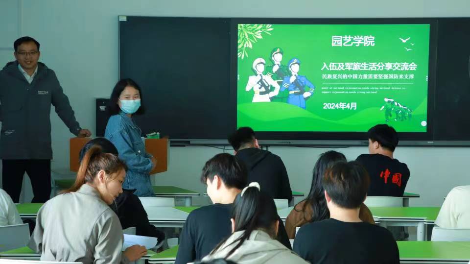 为贯彻落实征兵宣传政策,进一步加强大学生参军入伍的意识,加深对国家国防事业的关心,园艺学院于4月1日中午在实验楼2B306召开国防教育暨征兵宣讲会。会议由园艺学院武装专干郝玉伟老师主持,退伍复学学生牛文兰、卢焕坤和徐金鹏做分享报告,园艺学院80名有入伍意向的毕业生参加。