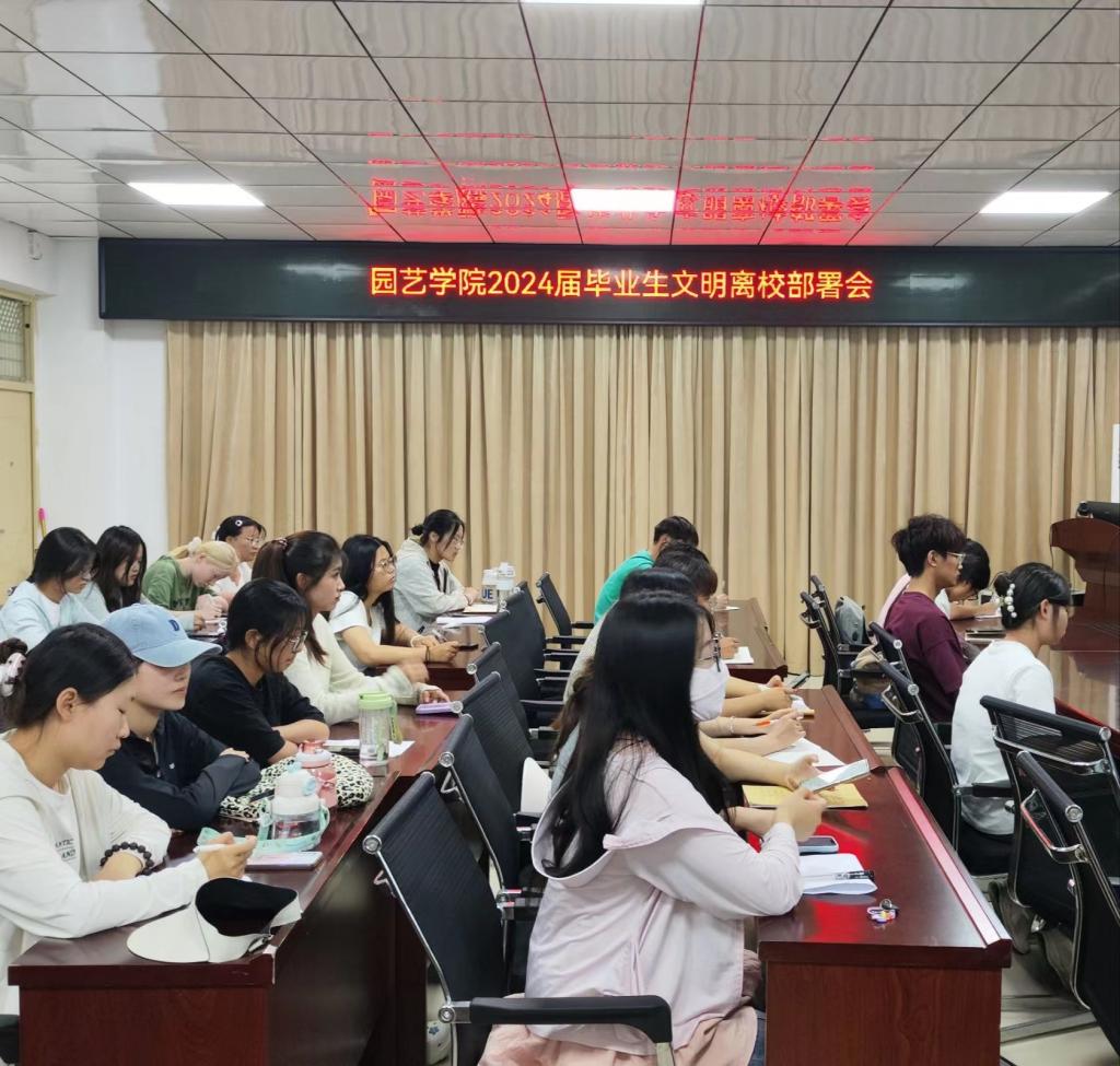 为确保2024届毕业生安全、文明、有序地离开校园,5月28日,园艺学院在2A322召开2024届毕业生文明离校部署会。学院党总支副书记孙琳苒、团总支书记王磊鹏和毕业生代表及学生会主要干部参加此次会议。