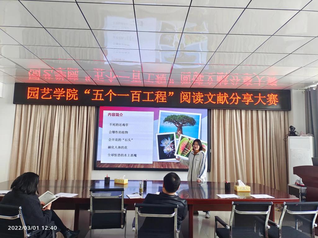 2022年3月1日中午,园艺学院在2A322会议室举办了“五个一百工程”——阅读文献分享大赛,学院党总支书记张祖成、副书记陈丽文、部分辅导员及学生代表参加大赛。