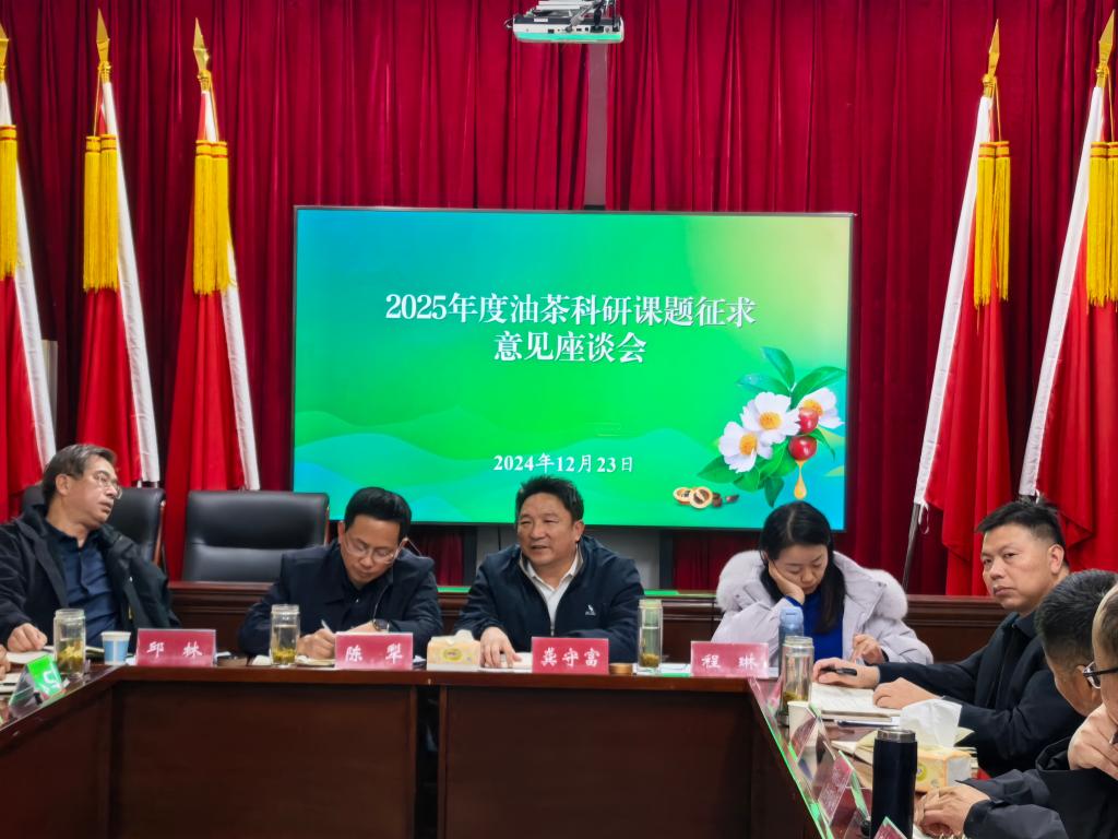 2024年12月23日,大别山油茶学院院长龚守富教授、河南省科技特派员朱振飞博士,应信阳市油茶产业发展中心邀请,出席了在市林业局五楼会议室召开的2025年度油茶科研课题征求意见座谈会。会议由信阳市人民政府机关党组成员、市林业和茶产业局党组成员、市油茶产业发展中心主任陈犁主持,旨在针对信阳市油茶产业发展中的关键技术瓶颈问题,征求各方意见,以推动科技成果转化。