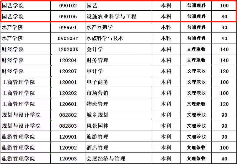 园艺学院2021年计划招园艺专业本科生100人、设施农业科学与工程本科生80人、园艺专业本科生(对口种植)60人。