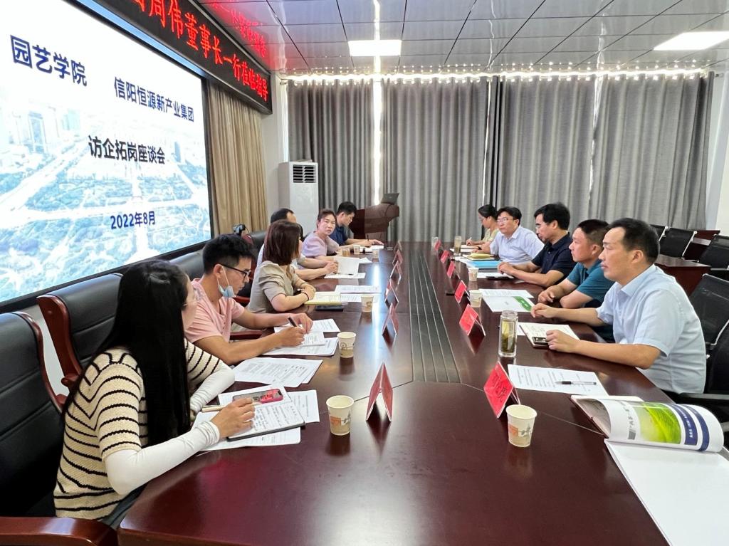 2022年8月12日,园艺学院邀请信阳恒源新产业集团经理周伟、信阳市中小企业公共服务平台主任刘丽娜一行6人到我院开展访企拓岗促就业座谈会,学院班子成员、部分科级干部参加了会议。