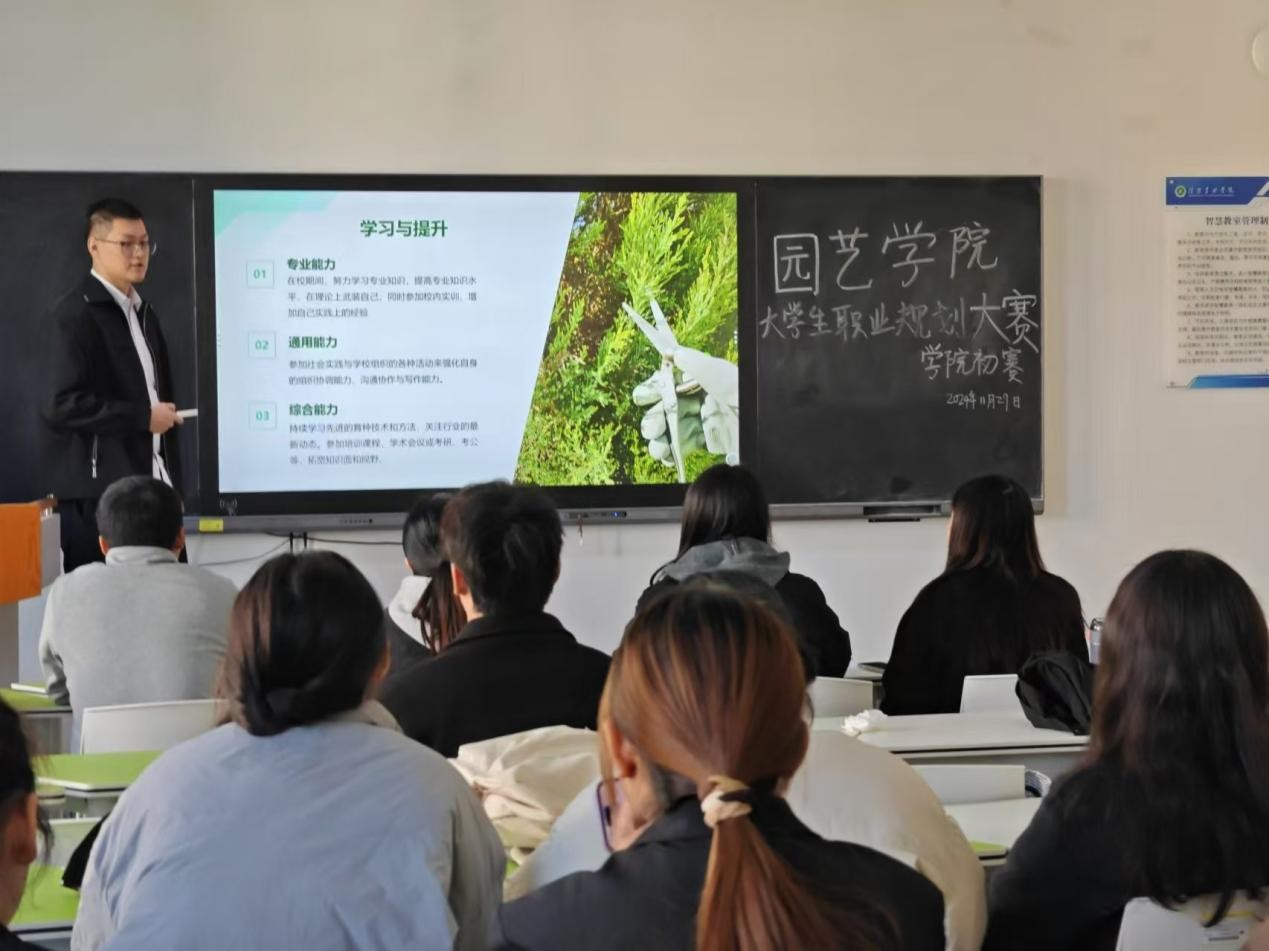 为引导我院大学生树立正确的成才观、就业观和择业观,科学合理规划学业与职业发展,提升就业竞争力,增强其职业规划意识,11月29日中午,园艺学院在实验楼2B307举办2024年大学生职业规划大赛院级选拔赛。园艺学院党总支副书记孙琳苒、创新创业专员董向向、专职辅导员马敏、专任教师张晶晶、程双飞老师担任本次比赛的评委老师。
