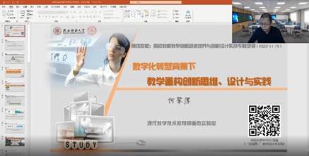 本次培训由何聚厚专家主讲,主要讲解了教学创新思维发展---数字化转型背景下教师教学能力发展内涵分析、教学重构创新设计---如何基于翻转课堂教学重构智能技术支撑的混合式教学、教学创新设计实践---如何基于国家智慧教育公共服务平台设计实践混合式教学等三个方面的内容。本次培训有针对性的讲解了什么是混合式教学、如何开展混合式教学、如何进行课堂效果评价等内容,使培训老师受益匪浅,为提升教学创新、打造一流课程提供了指导。
