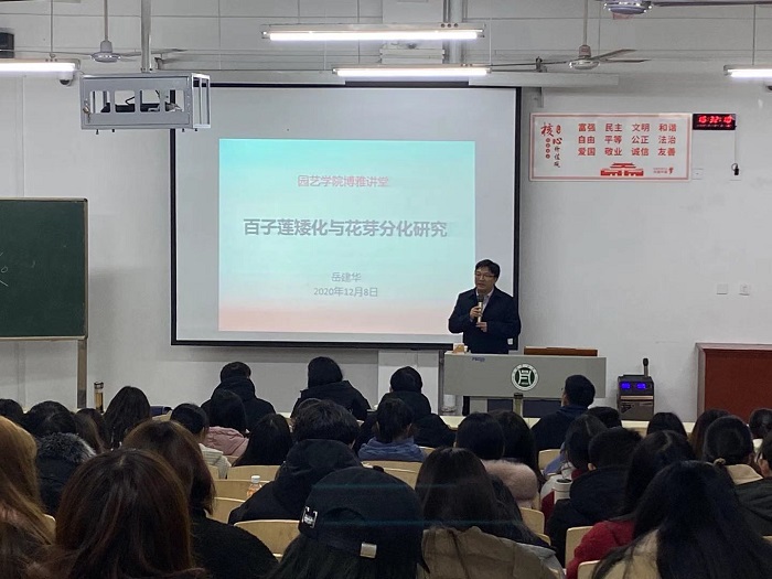 12月8日下午4点半,园艺学院师生在二教206教室举行2020下半学期博雅讲堂第四期,本期博雅讲堂邀请了本院博士岳建华作了一场关于“百子莲矮化与花芽分化研究”的学术报告。园艺学院院长龚守富、部分专业教师和学生共200多人参与了这次讲堂,讲堂由院长龚守富主持。